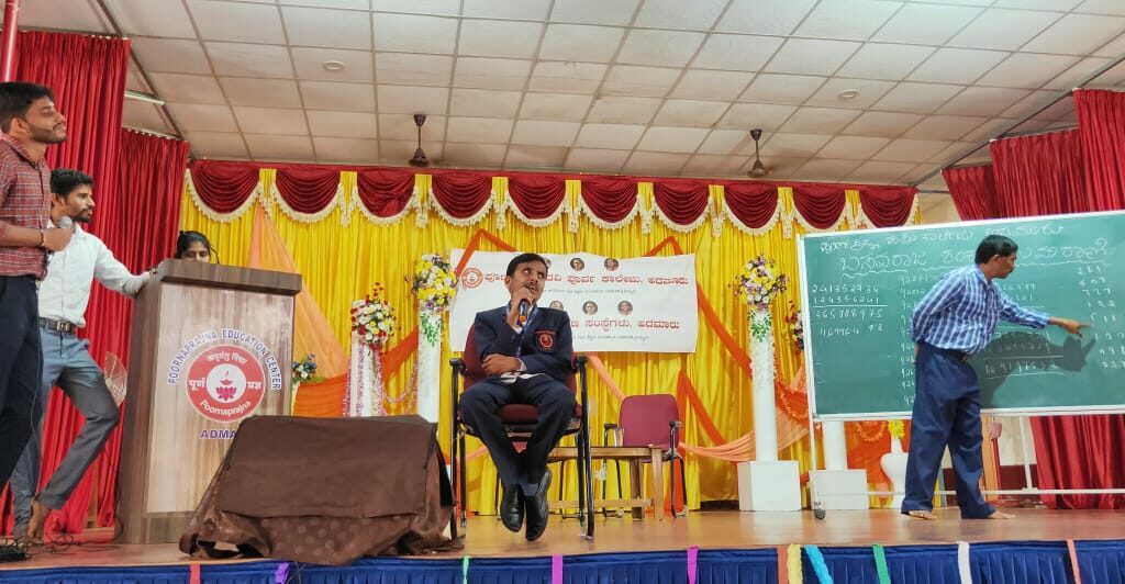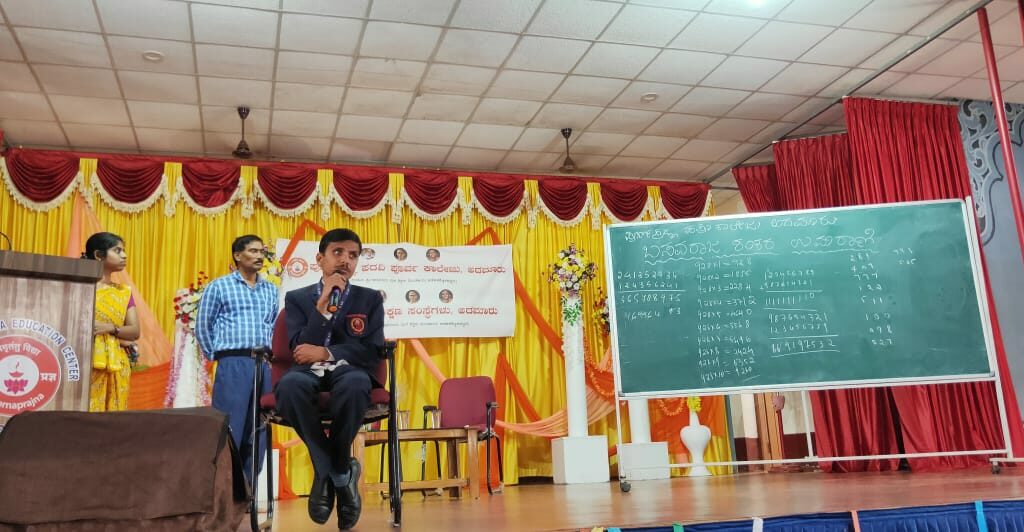 Description: Mr. Basavraj Shankar Umrani gave a demonstration of his mathematical skills by solving some addition, subtraction, multiplication and division of numbers in nine digits. He also revealed birthdays [days of the week] of students when they gave him their date of birth. All these math’s was done without using calculator, pen, pencil or paper.